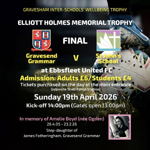 Congratulations to our 6th Form football team who have reached the final of the Gravesham Inter-Schools’ Wellbeing Trophy in conjunction with the Elliott Holmes Memorial Fund. The final against GGS is to be played on Sunday 19th April at the Ebbsfleet United ground, with the kick off at 2pm. Admission: £6 Adults/£4 Students. All are very welcome and encouraged to attend. Good luck St John’s!!!
